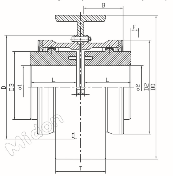 | 型號(hào) | 公稱轉(zhuǎn)矩 Tn KN.m | 許用轉(zhuǎn)速(n) r/min | 軸孔直徑 d1,d2 | 軸孔長度 L | D0 | D | D2 | D4 | B | F | C | 最大重量 kg | ||