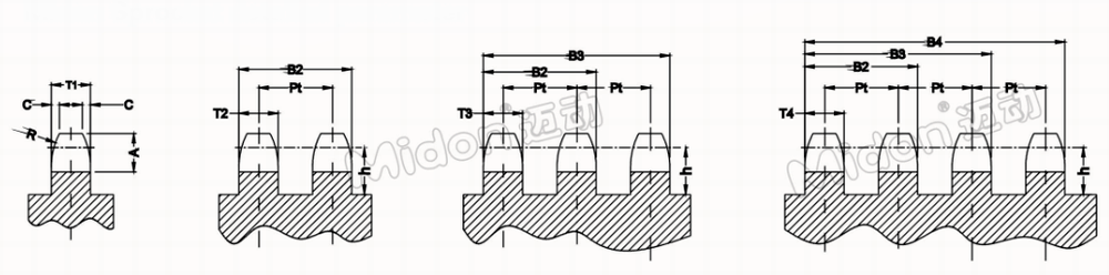 | SPROCKET NO: | pitch | Roller Dia | h | A | C | R | T1 | T2/T3 | T4 | B2 | B3 | B4 | Pt | ||