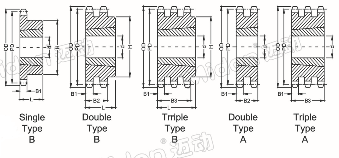 | 齒數(shù) Teeth | 外徑O.D | 節(jié)徑P.D | 型號(hào)/齒數(shù)-排數(shù) | 錐套bush | 最大孔 Max | B型凸臺(tái)Hub | 重量 W.t | 型號(hào)/齒數(shù)-排數(shù) | 錐套bush | 最大孔 Max | B型凸臺(tái)Hub | 重量 W.t | ||