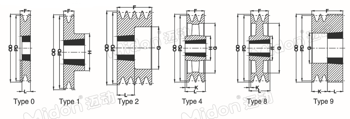 | PartNo:/PDGV 型號(hào)/節(jié)徑-槽數(shù) | O D 外徑 | Bush 錐套 | MaxBore 最大孔 | Type 圖列 | F 輪寬 | G 緣徑 | K - | L 轂厚 | H 轂徑 | Wt.Less Bush 重量 |