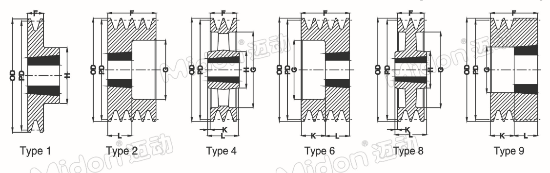 | PartNo:/PDGV 型號/節(jié)徑-槽數(shù) | O D外徑 | Bush 錐套 | MaxBore最大孔 | Type圖列 | F 輪寬 | G緣徑 | K - | L 轂厚 | H 轂徑 | Wt.LessBush重量 |