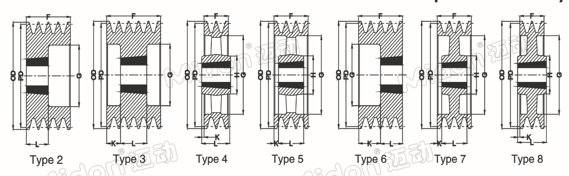 | PartNo:/PDGV 型號/節(jié)徑-槽數 | O D 外徑 | Bush 錐套 | MaxBore最大孔 | Type 圖列 | F 輪寬 | G 緣徑 | K- | L 轂厚 | H轂徑 | Wt.LessBush重量 |